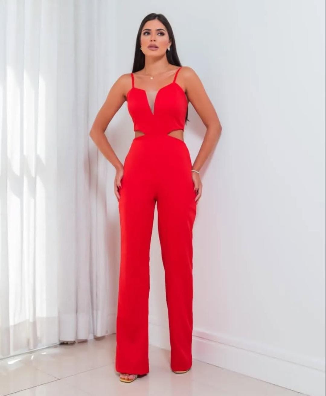 Macacão elegante com recortes modernos e perfeito para realçar a silhueta, trazendo um visual sofisticado e marcante para qualquer ocasião.