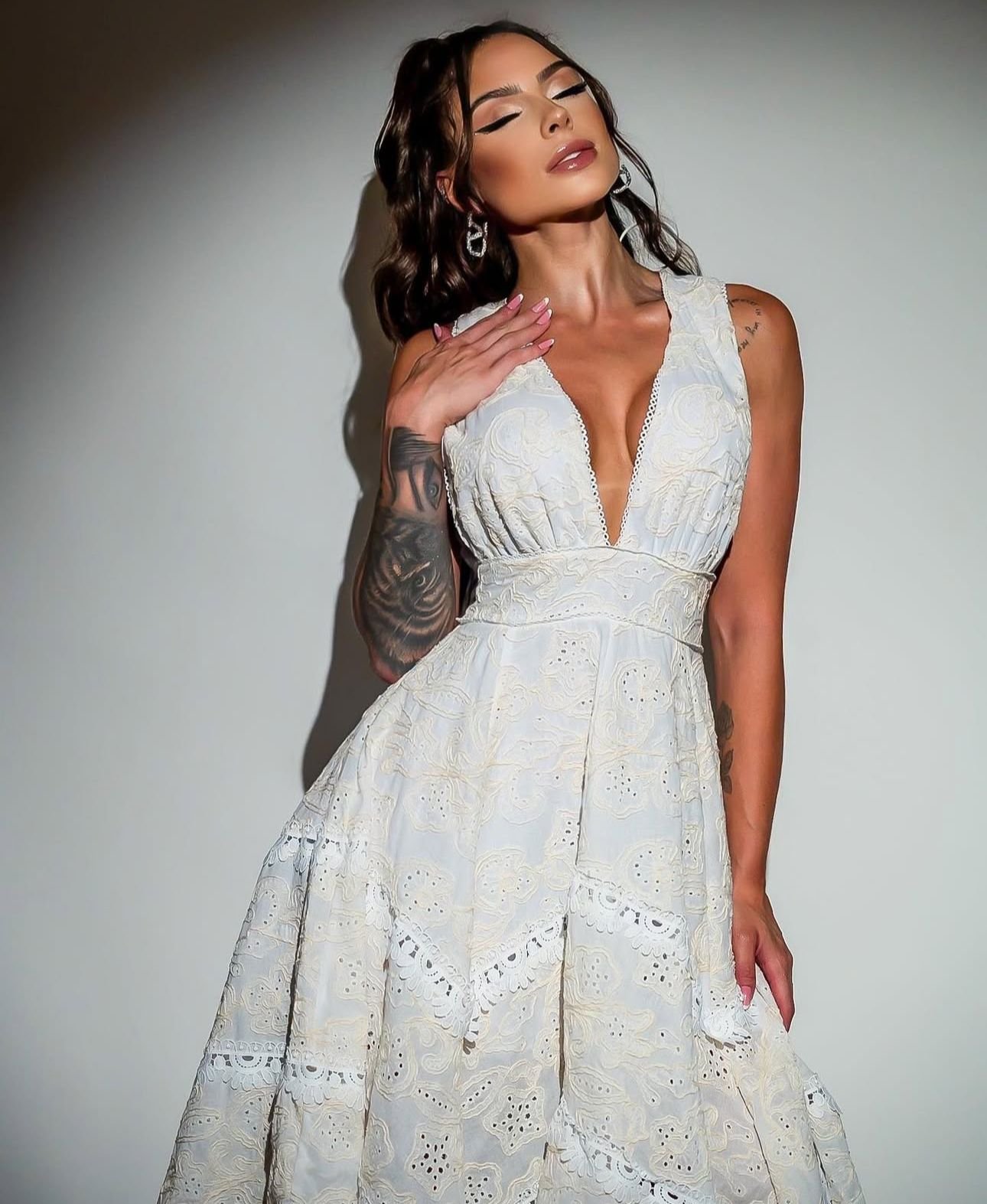 Esse vestido é a escolha perfeita para quem busca elegância e delicadeza em uma só peça. Com decote em V profundo e alças largas, valoriza o colo e traz sofisticação ao visual. A cintura marcada realça as curvas femininas, enquanto a saia fluida em camadas com detalhes vazados garante movimento e leveza. O comprimento longo e a barra assimétrica tornam o modelo ainda mais imponente, perfeito para eventos formais, festas ou ocasiões que pedem um look inesquecível.